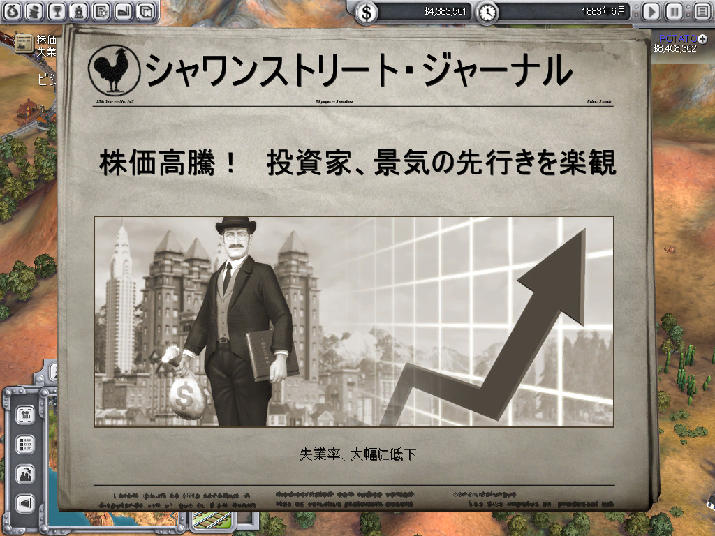 レイルロードで忘れてはならないのが,時間の概念だ。時間の経過には,まず新車両の登場が関係している。1800年代前半は小型の蒸気機関車しかないが,徐々に大型でパワフルな機関車が出現する。シナリオの勝利条件には達成期限が定められており,たまに発行される新聞の時事ニュースも,経済に影響を与える。