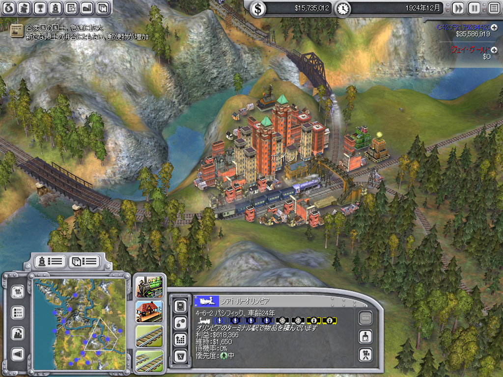 鉄道によって人が運ばれ,需要のある物品が十分に供給されることで,各都市は「村」→「町」→「都市」→「大都市」と成長していく。都市が大きくなれば,それだけ需要のある品目も増えていき,何を運んでも儲かるようになっていく。さらに「精製所」「食品加工場」など産業のキャパシティも増えるので,さらなる増収と発展も見込めるわけだ。
