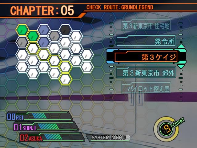 ストーリーは,NERVのアメリカ第2支部が消滅する直前,剣崎キョウヤによって第2支部から謎の“実験素材”がNERV本部に搬送されるところから始まる。ゲームはチャプター構成となっていて,行き先を選択することで進めていく。チャプターごとの行動可能回数は決められており,その中で任務を遂行しつつ,物語に隠された謎を追っていくのだ。