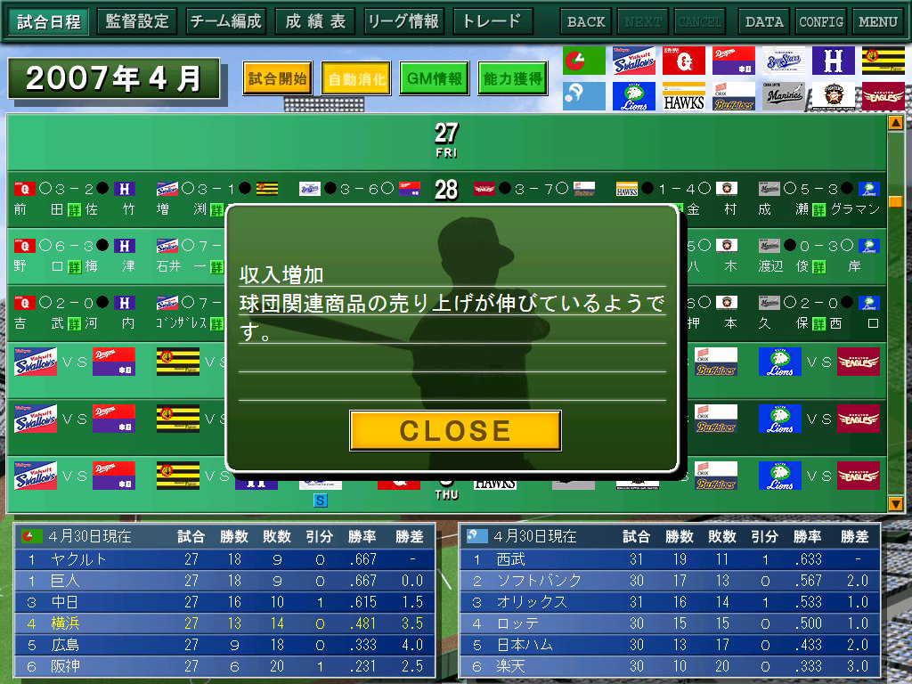 戦プロ07にはアクション要素が一切ない。基本的にはチームの監督として采配を奮い,自軍を優勝に導くことがゲームの目的となる。
