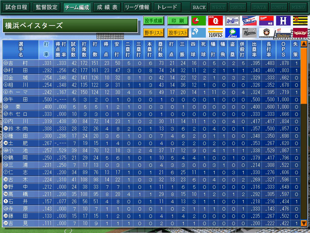 プロ野球ファンはデータにこだわる人が多いが,戦プロ07はその点も充実している。投手の登板数,勝利数,防御率や打者の打率,ホームラン数,打点数などはもちろんのこと,投手のホールド数や打者のOPS(出塁率+長打率)などのデータも簡単に閲覧できるのだ。