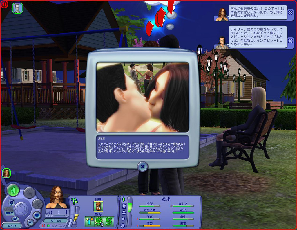 「三人のシムを口説く」など目標の内容がやや難しく,また,指示のない時間もちょっと長いなど,シムズ中〜上級者向けとなっている。とはいえ,資金的にかなり余裕がある(ヴィンスは金持ちなのだ)ので,買い物を楽しむのも面白い。