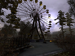 「石棺」と呼ばれるコンクリートで封鎖された4号炉にはさすがに近づけなかったそうだが,GSC Game Worldのスタッフは現地取材を重ね,ゲームの中にリアルな町や建築物,集落などを再現している。自社開発のゲームエンジン,X-Rayによって描き出されるグラフィックスは,荒れ果てたZONEの雰囲気をよく伝えており,社会からはみ出し異形の世界に生きる道を求める男達の心象風景を映し出しているようにも見える。チェルノブイリ原発跡や,ゴーストタウンになったプリピャチ市のビル群の存在感も圧倒的だ。人員と時間を惜しげもなく使ったスラブ的重厚さが感じられるだろう。