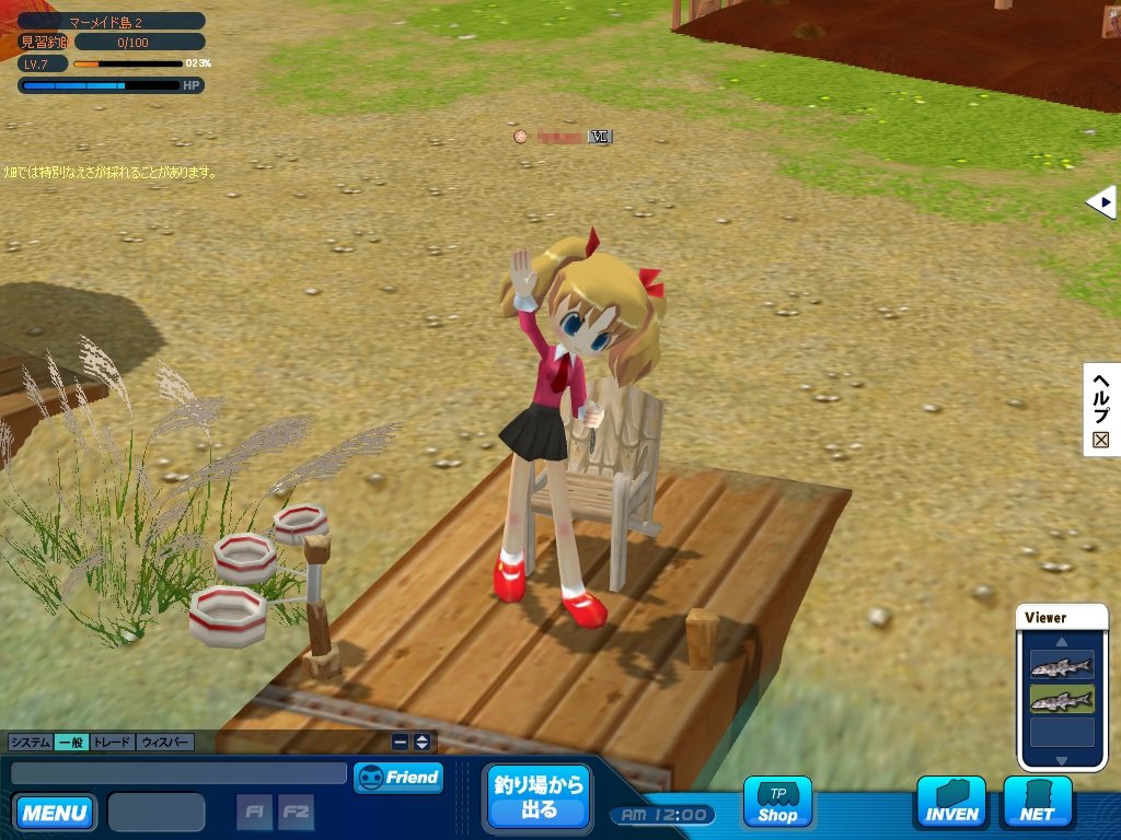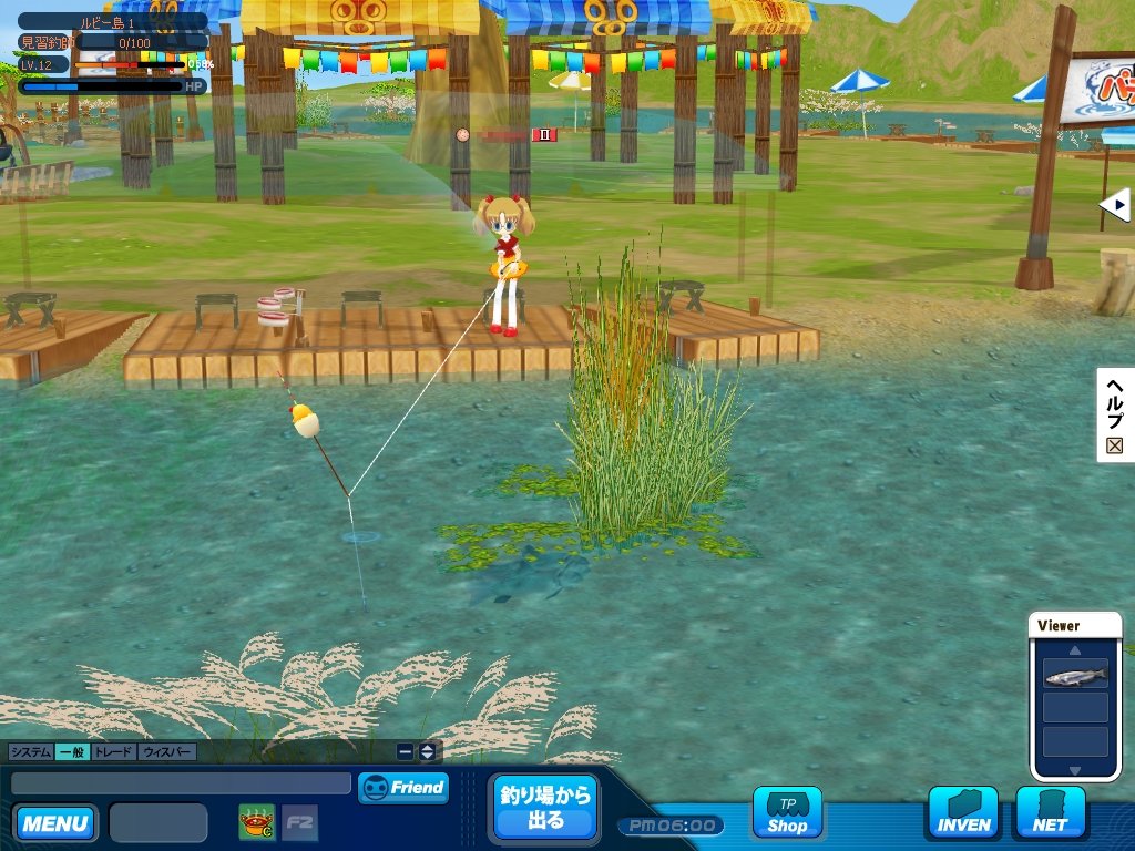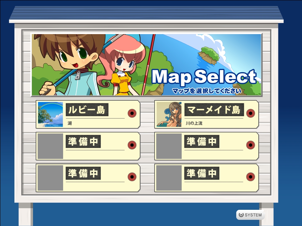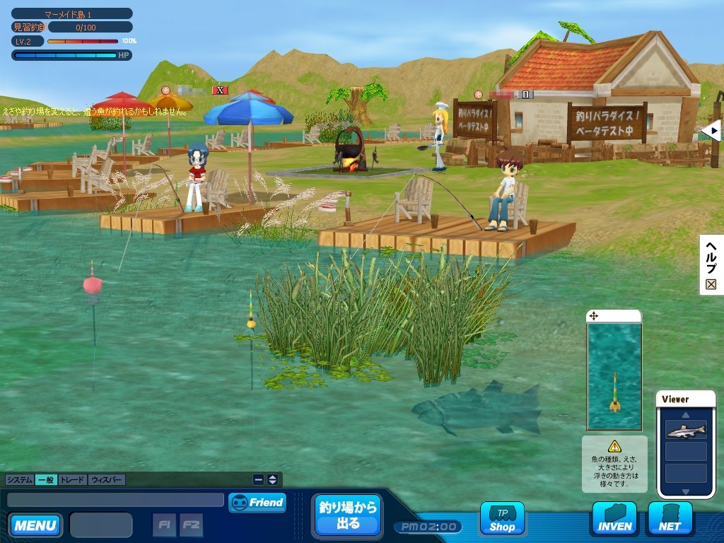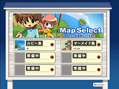 本作の舞台は,日本のどこかにあるという「パラダイス県」。クローズドβテストで選べたマップは,「ルビー島」と「マーメイド島」の二つだ。どちらも淡水で,景色も似通っていたのがちょっぴり残念であった。両マップの違いは,釣れる魚の種類が少々異なる点だけで,難易度の差などはとくに無い。空いている椅子をクリックして座れば,すぐに釣りを始められる。