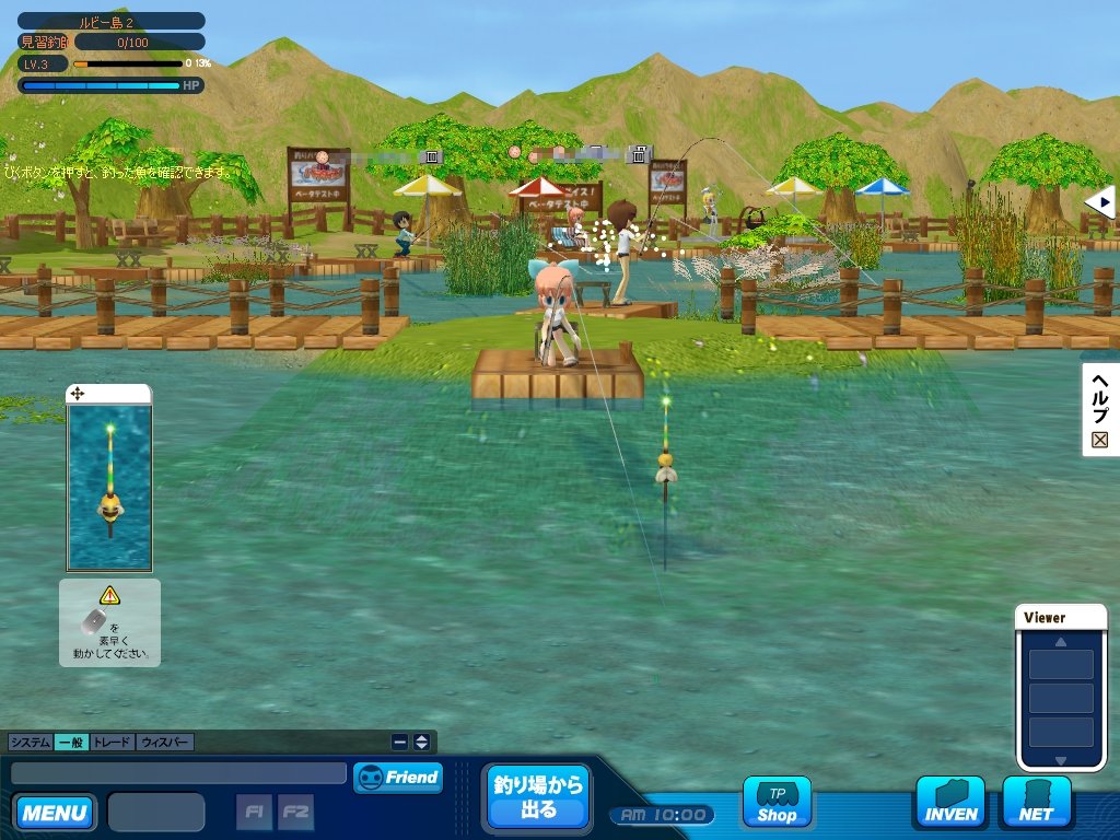 少し残念だったのは,魚がかかるまで1〜2分,長いときで4分近く待つ必要があるにもかかわらず,ウインドウモードに対応していないこと。比較的待ち時間が長いゲームだけに,ウインドウモードでの“ながらプレイ”には,できれば対応してほしい。今回は二つだけだった釣り場に関しても,今後の充実に期待したい。また,釣りゲームファンの多くが持っていると思われる,コレクター心を満たすのに,魚図鑑だけではいささか寂しい。次回のテストでは,公式サイトでは紹介されているが未実装だった「水槽システム」で,泳ぐ魚の姿をぜひ見たいものだ。