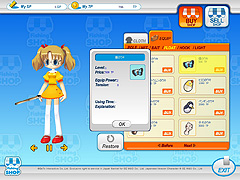 さらに「装備値」というちょっと変わったステータスは,アバターアイテムを身につけることでアップし,HPの増加+大きな魚が釣れる効果がある。アイテムには洋服や眼鏡,バッグといったお洒落アイテムと,釣り竿,ウキ,びくといった釣り道具があり,それぞれに「HP+10」「パワー+5」などの効果がある。夜釣りには必須となる消費アイテム「ライト」はショップでしか買えないので,注意が必要だ。ごくまれに魚と一緒に衣装が釣れることもあるが,これらはショップで購入したものよりもボーナス値が高い。