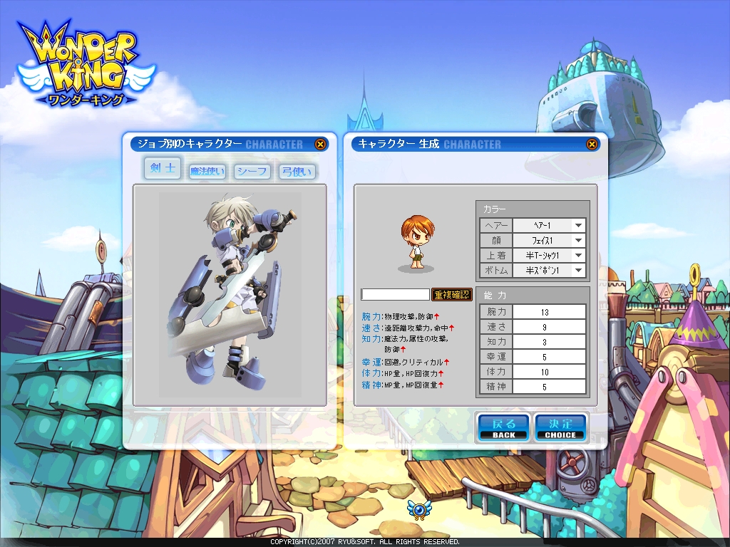 アカウント一つにつきキャラクタースロットは三つまで。初期ステータスはクラス別に固定だが,キャラクターの外見は髪型・顔つき・初期装備の色を選択できる。ただし,装備品にはクラスとレベルによる制限があり,バリエーションも少なく現時点では見た目で個性は出せない。今後,見た目重視のお洒落アイテムが実装されれば,楽しくなりそうだ。