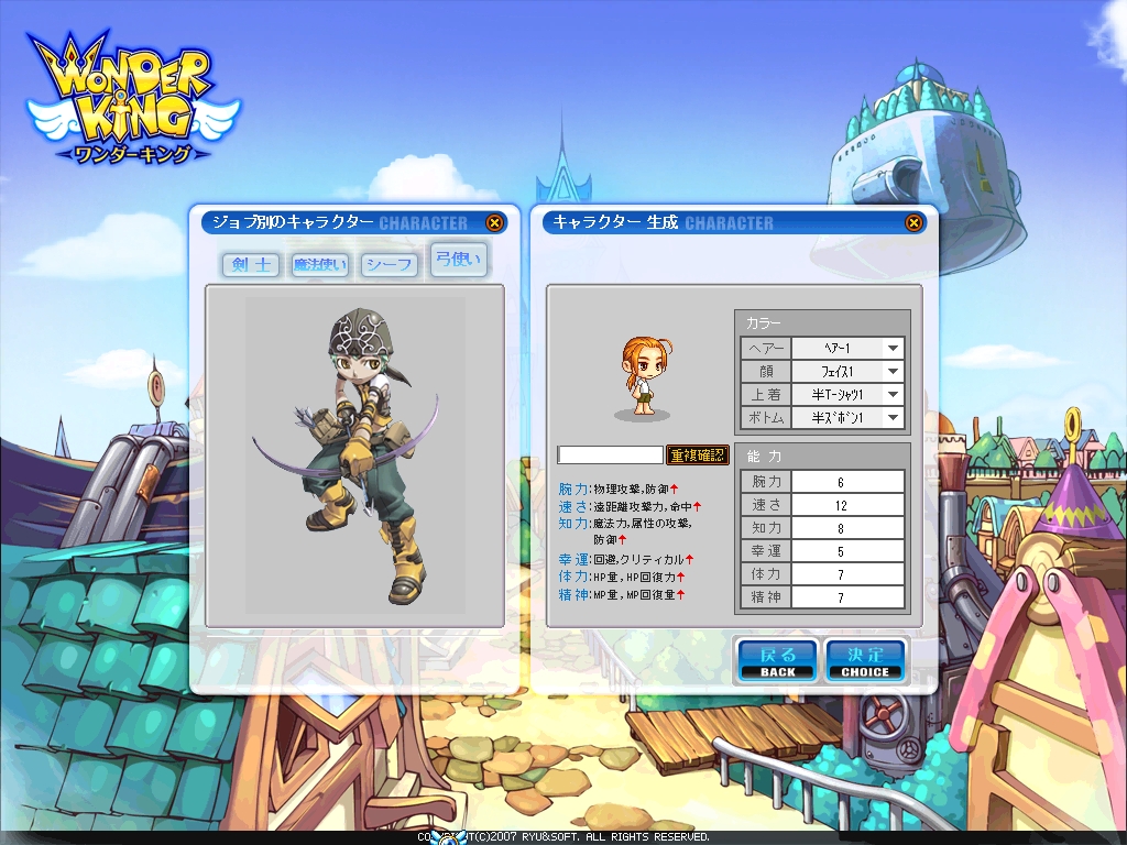 | 各ステータスにカーソルを合わせると,「弓使いの物理攻撃力が上がる」「全ジョブの魔法防御力が上がる」といった表示が。ステータス値の意味が分からないRPG初心者には,優しい配慮だ |