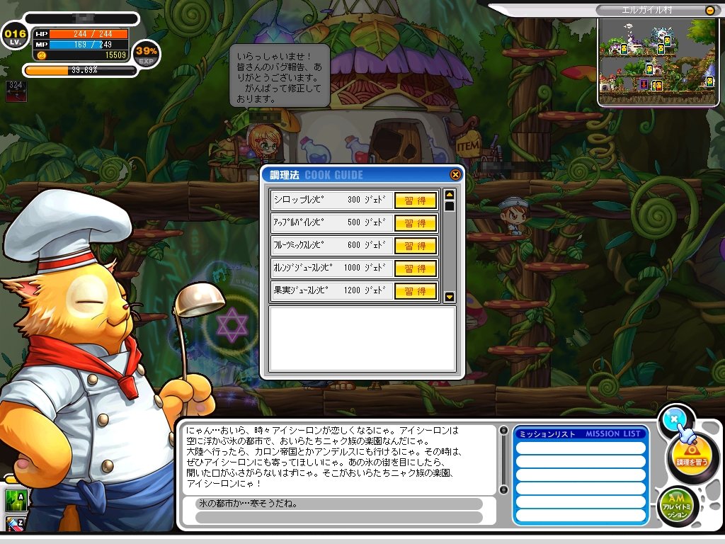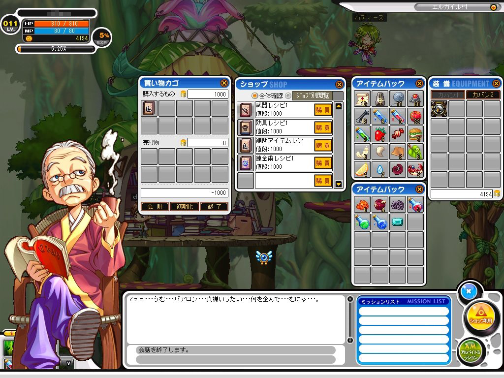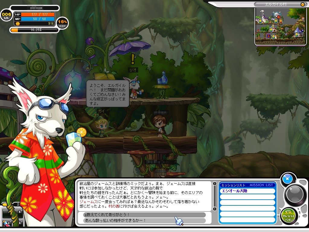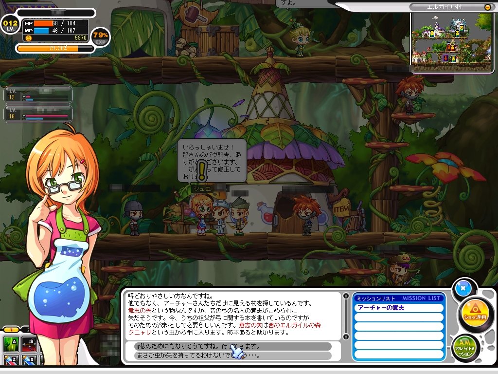 クエストの多くは,指定されたモンスターを倒す,あるいはそのドロップアイテムを集めてくるという内容で,レベルに合わせて最適な狩場やモンスターが指定される。しかし一定レベルに達した時点で受けられるミッションの中には,ワープゲートから入る特殊フィールドで,一定時間街を守ったり,制限時間内にボスを倒したりといったものも用意されている。見事完遂すれば,お店では購入できない装備品をもらえるが,それなりに難度は高いので周囲の人を誘ってのパーティプレイをお勧めする。エルガイルの村で受けられるミッションには「希望の章」「勇気の章」「信頼の章」「生意気な奴」の四つがある。