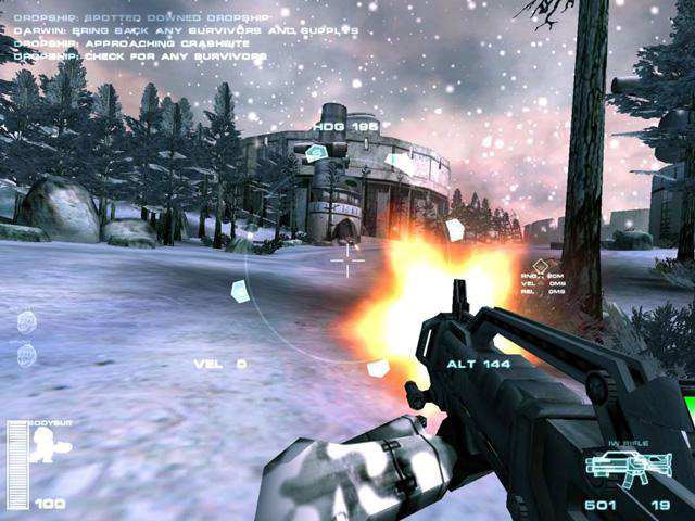 実際のアクションが始まるのは,着陸したドロップシップのメインゲートが開いてからだ。実はプレイヤーは一人ではなく,ほかにも4人の仲間が搭乗している。「Halo」や「Tribes」のようなタクティカルアクションを連想させるもので,ワンキーでどのキャラクターも操作できるようになっている。そういうプレイが好みではない人には,ほかのキャラクターに一定の行動パターンを設定するためのコマンドシステムも用意されていて,あとは秀逸な思考ルーチンが補ってくれる。このほうが,実際のFPSの感覚に近いだろう。