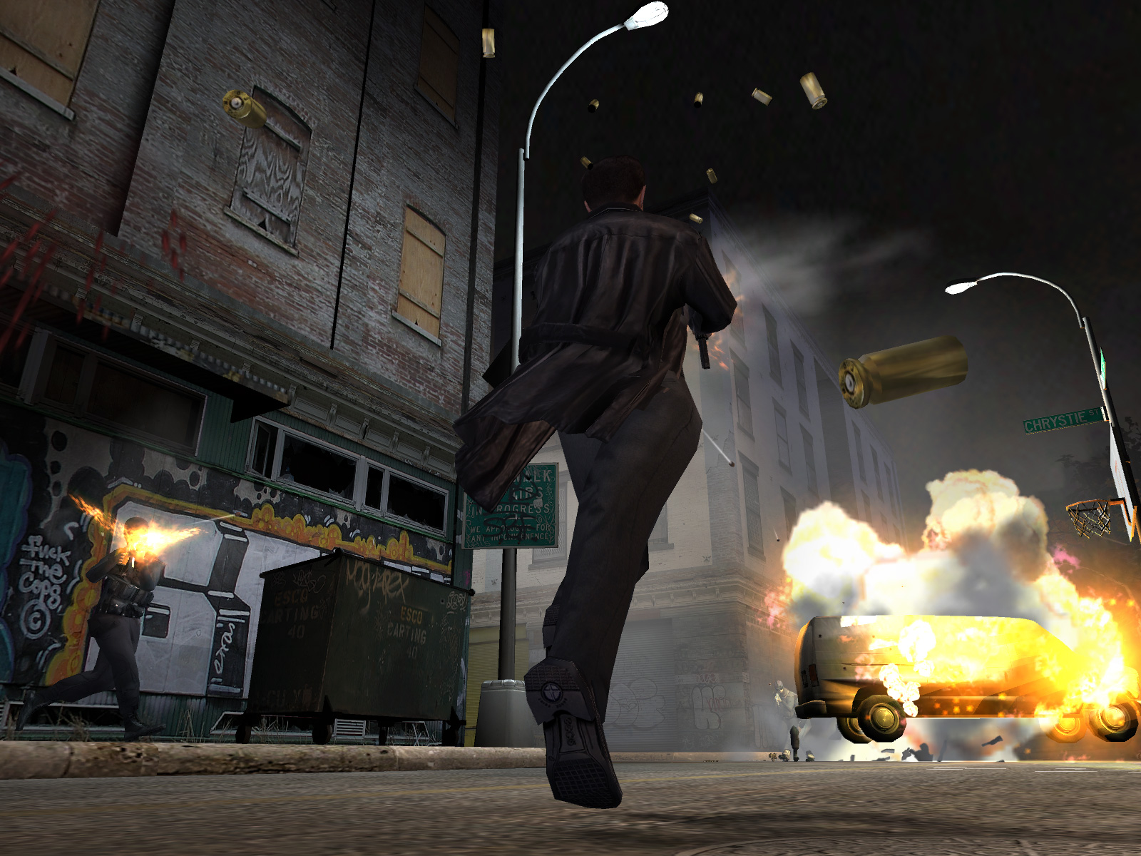 Payneシリーズのイカしているところは,やはり3Dゲームの特性たる部分を見事に生かしたバレットタイムの実装にほかならないだろう。普段は主人公キャラクターの背後にカメラを置いた第三人称視点でゲームが進められていくが,アクションが激しくなってくると,カメラが主人公の前方に移動し,映画風のダイナミズムを与える。自分(マックス)というキャラクターが活躍していることを,プレイヤーにしっかりと認識させることを可能にしているのだ。