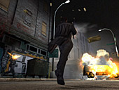 Lighting)を用いているからで,影が強調されることによってノワール的な雰囲気が最大限に表現され,路上の水溜りに反射するネオンサインなど,大都市の雰囲気もよく表現されている。パーティクル効果も向上していて,金属質のオブジェクトが弾丸を受けて火花を散らすのが,ロケーションや角度,距離によって異なるという細かさだ。
