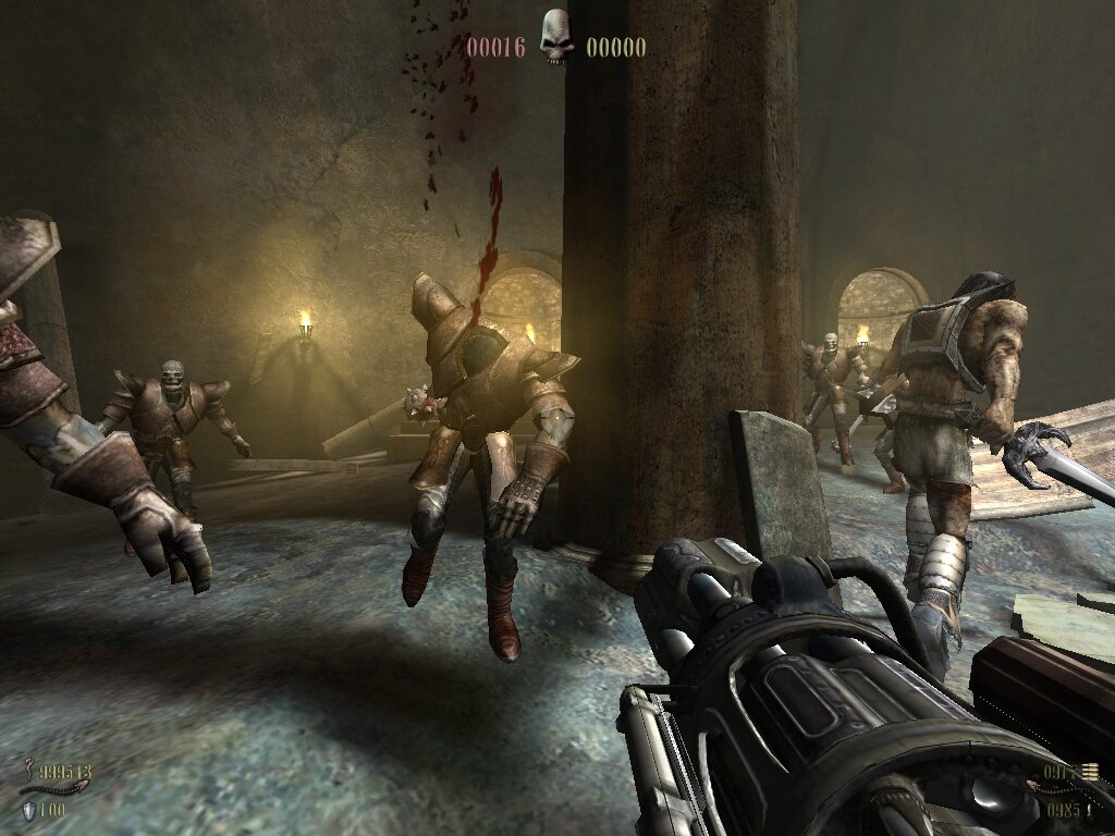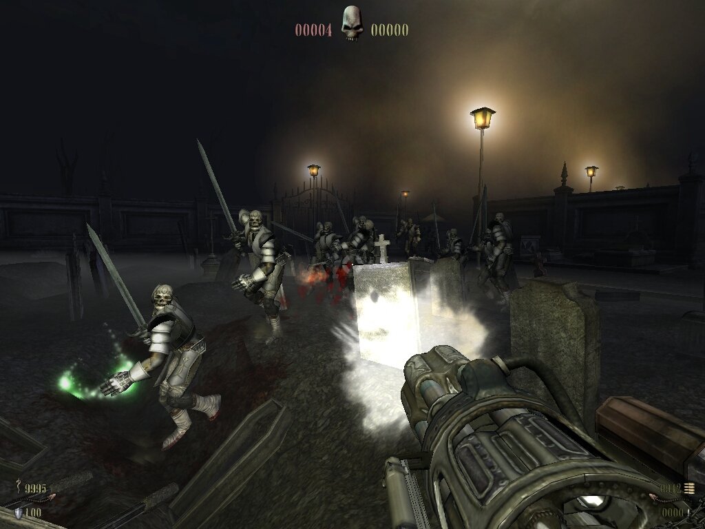 すでに何度か書いているように,Painkillerはプレイヤーの条件反射に依存したスリリングなアクションゲームとなっている。綺麗なグラフィックスのゲーム世界を眺めている時間もないほど大量のモンスターが襲いかかり,常に移動とマウス左ボタンの連打,そしてヘルス値を確認しておかなければならないといったシチュエーションが続く。