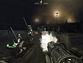 被弾によって飛び散る木片や敵の投げる武器が,かなり画面を賑やかにしている。戦術の物理効果はこのような小型オブジェクトにも反映されており,別のオブジェクトにぶつかれば違う方向に飛んでいくし,木箱は爆発によって燃え出したりする。もちろん,モンスターが吹き飛んだり階段から落ちていく様子は,Half-Life2と同じように体をくねらせながらのラグドール効果を鑑賞できる。