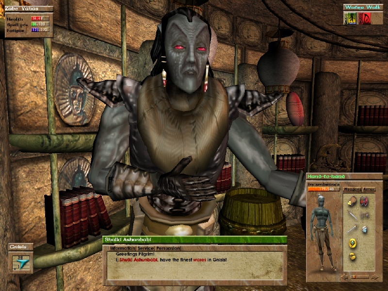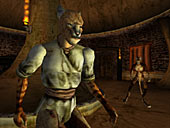 Morrowindは,第1人称視点ばかりでなく,プレイキャラクターの全体像を背後から追う第3人称視点のカメラモードでもプレイできる。また,基本的にはキャラクターの進行方向によって武器の振り方が変化するようになっている。さらにマウスボタンを押し続けることによって,フルチャージの状態で剣を振り下ろしたり,ナイフなら連続して"突き"を出せるのだ。ただし,激しい攻撃を続ければスタミナが消耗して動けなくなるので,敵の攻撃もかわせるように防御のレベルも上げておくべきだろう。