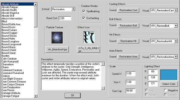 Morrowindのマジックシステムは,Daggarfallと同じような仕組みで,例えば攻撃用の魔法と,範囲などの効果を指定する魔法を組み合わせるようになっている。魔法には宗派の概念があり,破壊(Destruction),変形(Alteration),幻想(Illusion),祈祷(Conjuration),神秘(Mysticism),復活(Restoration)の6派が存在する。マジックユーザーを目指すなら,この中の一つの宗派に属さねばならず,それによって魔法の得意不得意が出てくるのだ。ゲーム中に用意されている魔法は130種類程度で,さらにスペル系やポーション系などに別れている。
