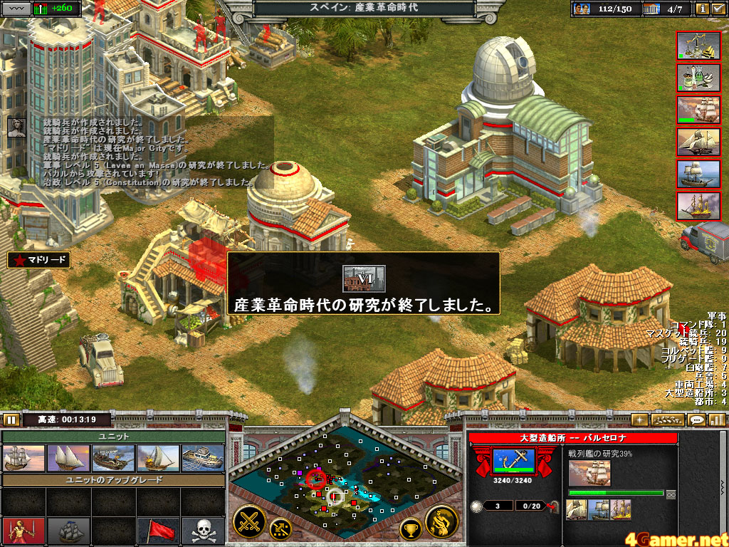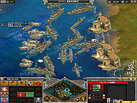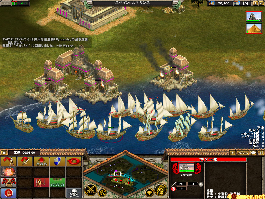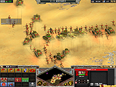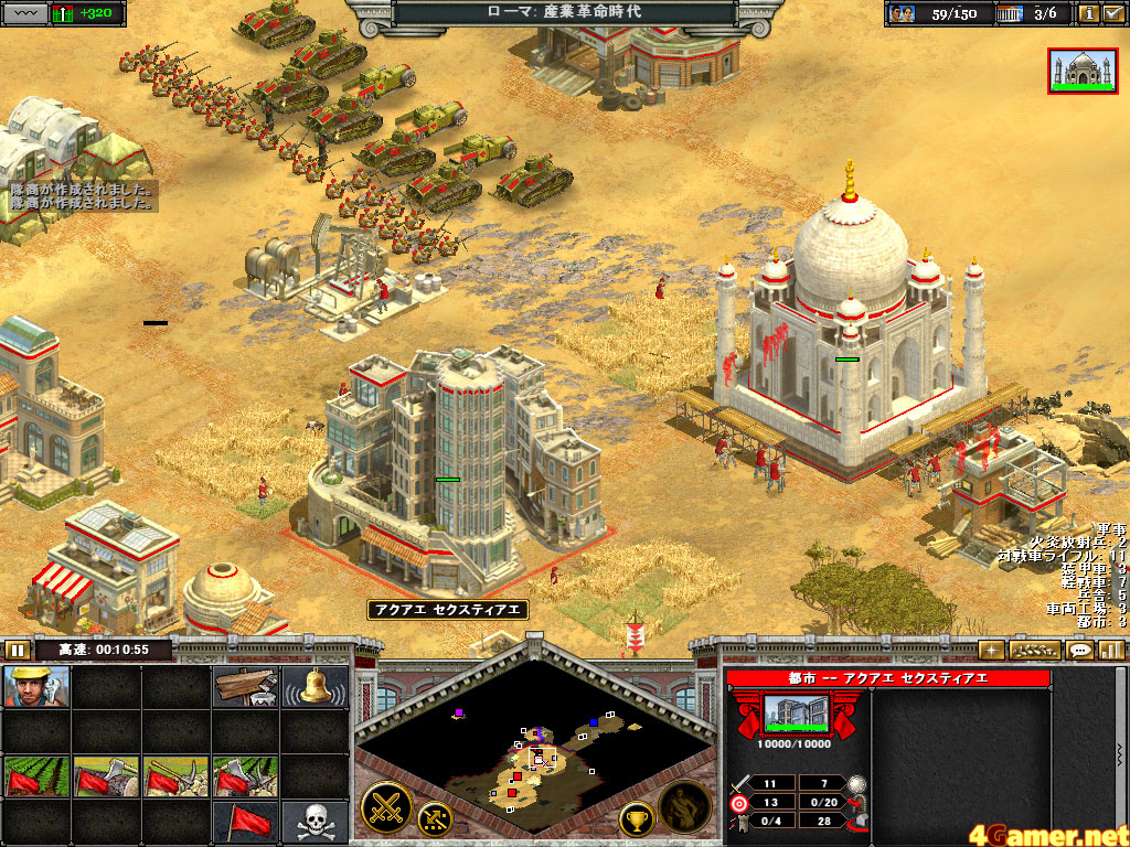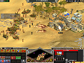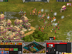 RoNでは,生産ユニットである市民を使って資源を集めるわけだが,AoEやEEのように「ユニットがちょこちょこ動き,資源を採ってそれを町や貯蔵庫に持ち帰ることで資源獲得」という形ではない。各町や資源の採集所ごとに「市民を割り振れる数」が決められており,そこに市民を割り振ると,時間ごとに一定の資源が入ってくるという仕組みになっている。一人なら30秒で10の資源を獲得でき,2人なら20という感じだ。経済ユニットの移動効率などを考えなければならなかったAoEやEEなど内政システムが,多少ブラックボックス的な側面を含んでいた要素であったのを思うと,RoNの内政はかなり明確化された形になっていると考えてよいだろう。つまり,画面上ではリアルタイムに作業している様子が移されるが,内政のシステム自体は,ターン制ストラテジー的な要素で固められているわけだ。