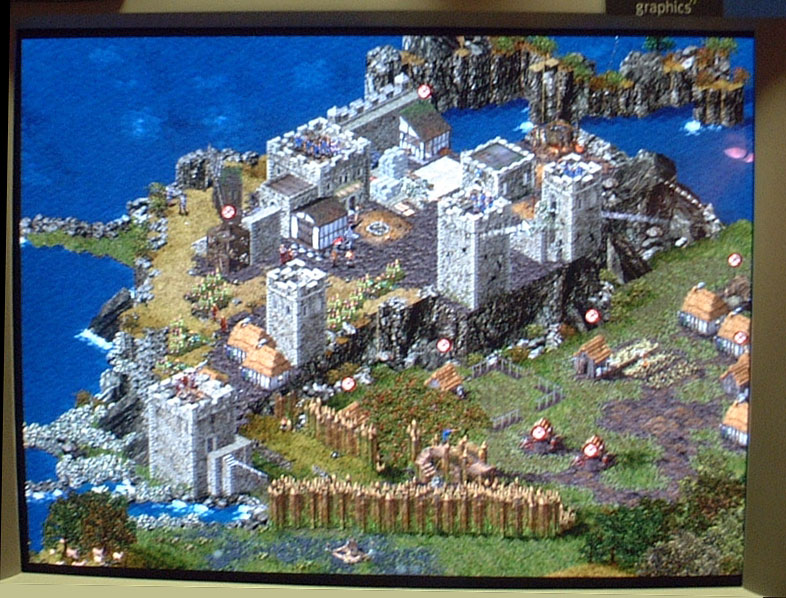 E3開催の前から噂だけは聞こえていた,GODの「Stronghold」。どんなゲームなのかというのは,E3速報の「ここ」を参考にしてもらいたい。様々な民衆の声を聞き入れながら城内を統治して税金を集め,そのお金を元に自分の居城を強化していくという"Sim的"な要素はStrongHoldの題材であり,なおかつ最も注目すべき売りとなる部分だ。