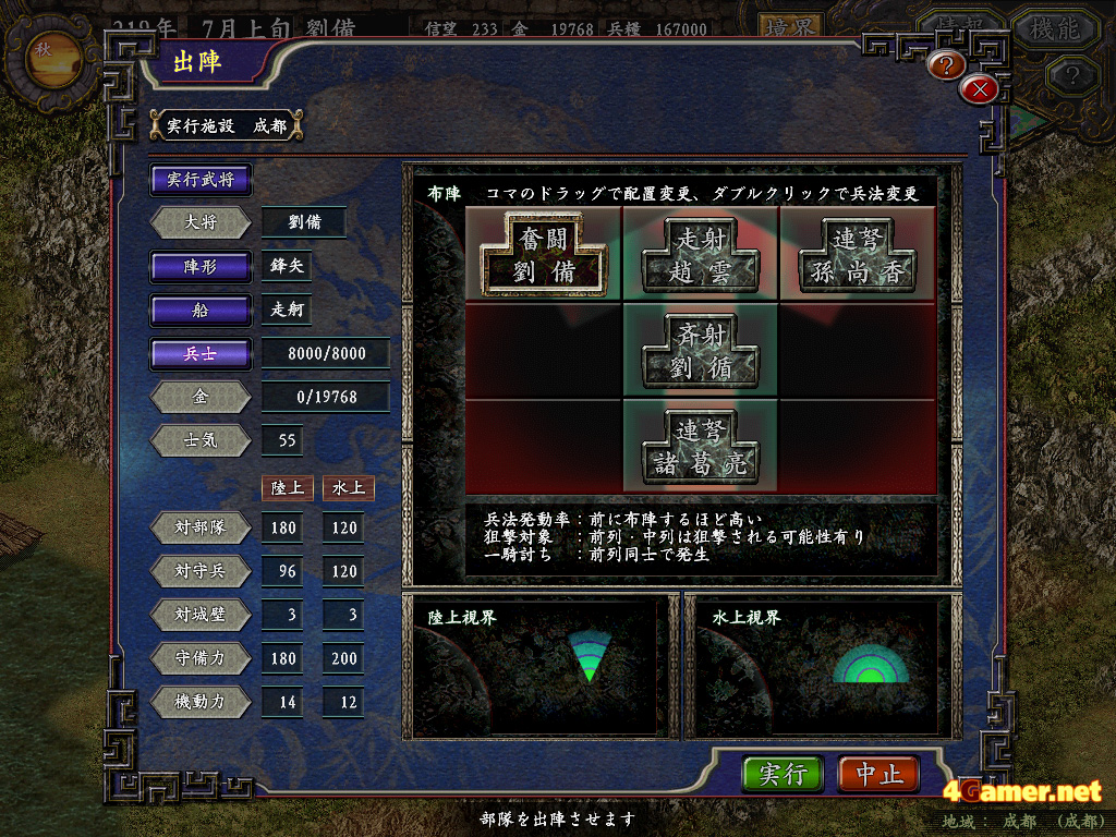 次に部隊の陣形を選択する。陣形には魚鱗,鶴翼など12種類が用意されており,その種類は出陣する武将により上下する。例えば諸葛亮などは一人で11種類もの陣形を持っているが,趙雲は8種類しか持っていない(8種類の通常陣形は誰でも持っており,残り4種類の陣形には,それぞれ兵法が必要となる)。また陣形には攻撃力は弱いが防御力が高い,野戦には弱いものの攻城戦には強いといった一長一短が設定されているので,あらかじめどのような戦闘になるかを予測した上で選ぶ必要がある。