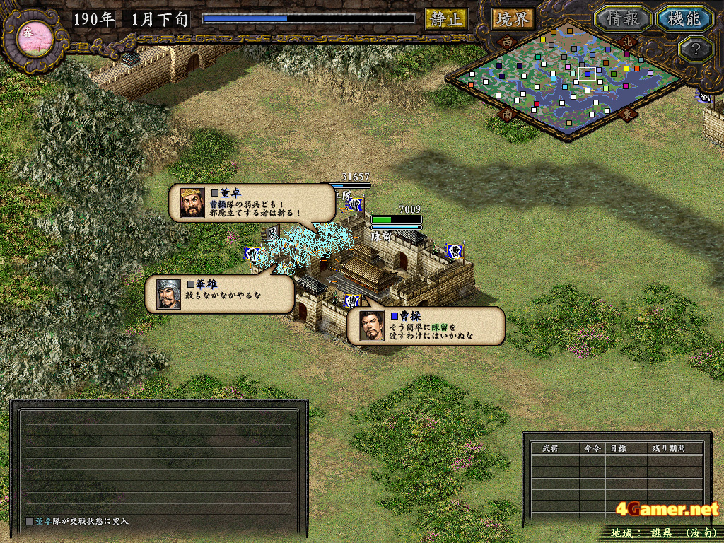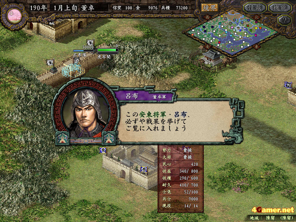 | 陣形を決め,出兵先を選択すれば,あとは武将の力量次第。呂布の言葉が頼もしい |