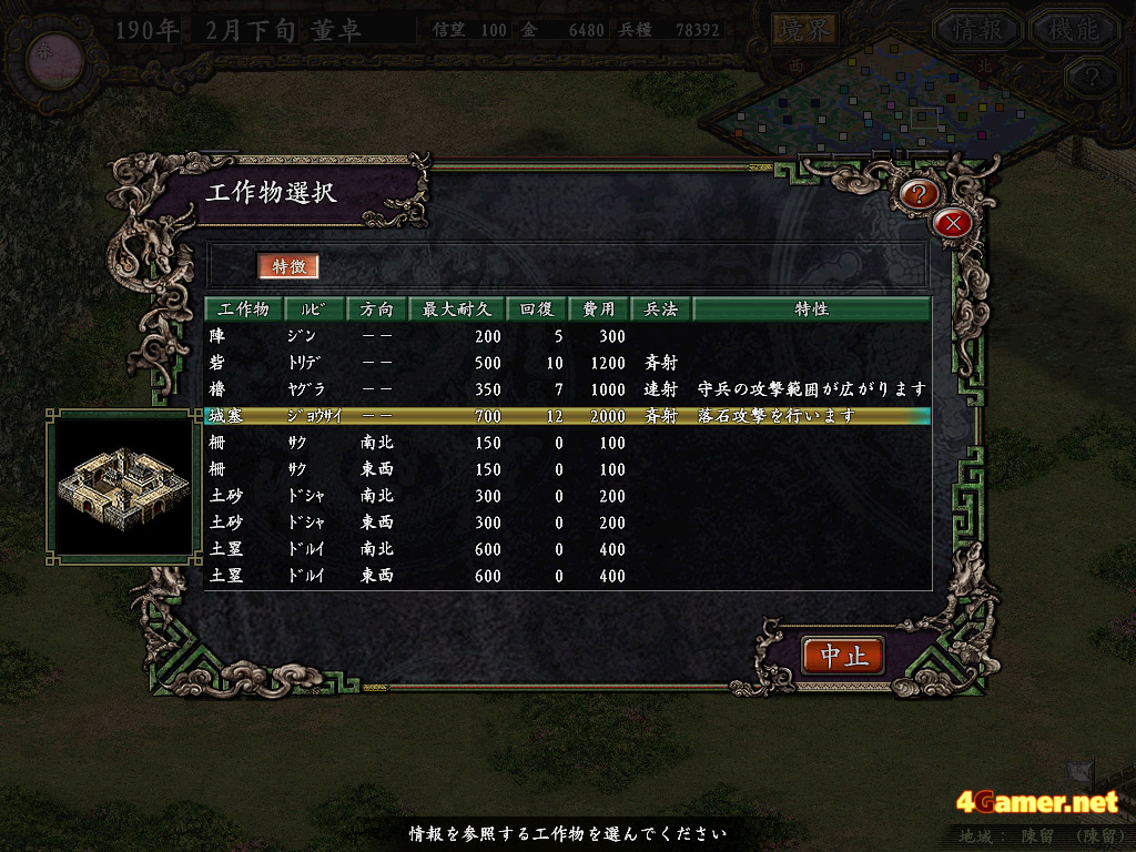 具体的には,戦略フェイズ中に建設を行わせる武将を選出,何を建てるかを決定して実行してやれば,次の進行フェイズのときに,建設部隊が出て行って,建設場所に建設する。選んだ武将の率いる兵士数や能力値によって,建設が終了するまでの時間が変化する。最前線の重要な拠点を,能力の低い武将に建設させていると,1回や2回の進行フェイズでは建設が終わらないこともあり,危険この上ない。