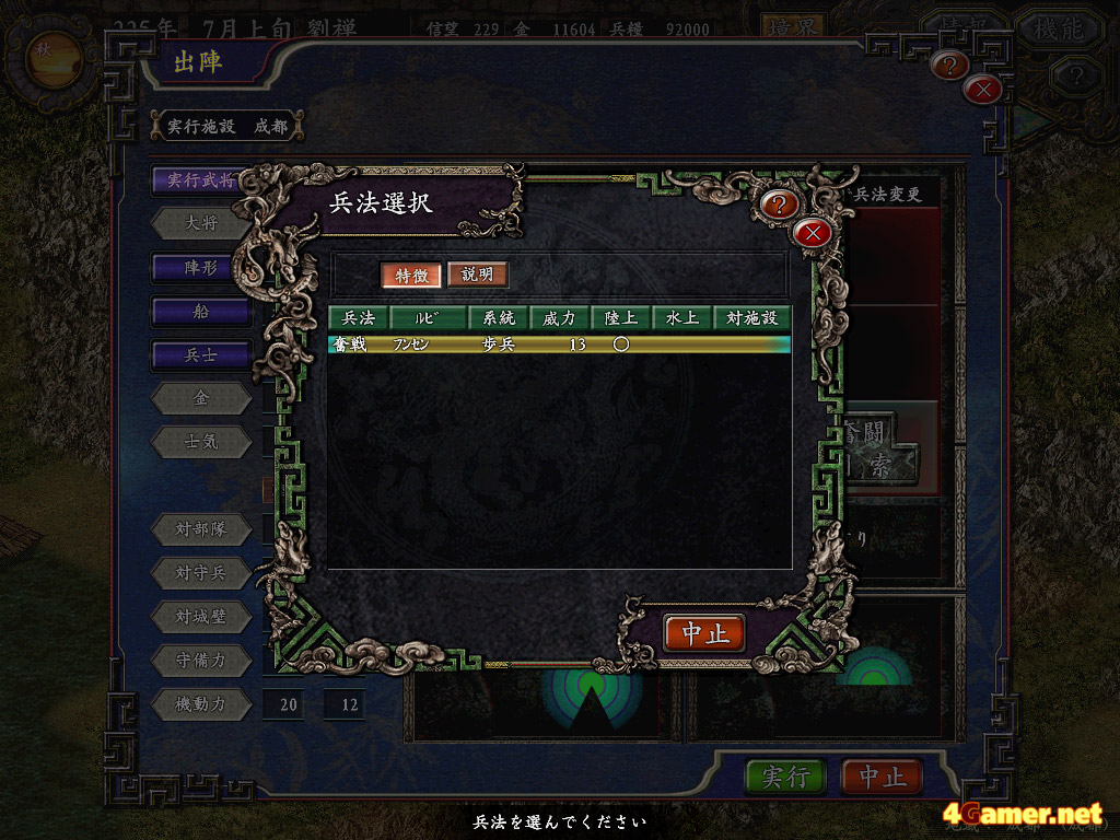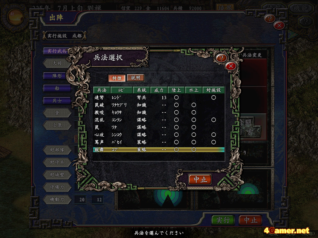 そして武将個人が持っている兵法を選択する。これは各武将がもつ戦闘特技のようなもので,騎馬で走りながら馬上から弓を射る"騎射"や,敵を混乱させる"混乱"など20種類以上が用意されており,あらかじめどの兵法を戦闘中に出させるかを決めておかなければならないのだが,兵法の発動はプレイヤーが戦闘中に指示することはできない。いつ,どこで,誰が兵法を発動させるかは,やってみなければ分からないのだ。