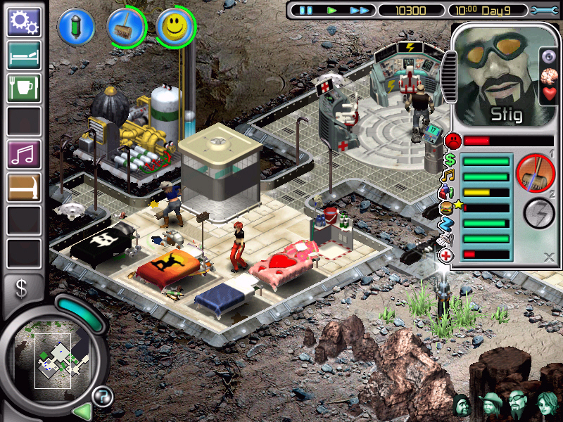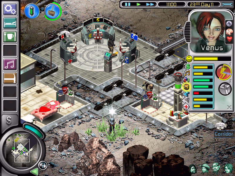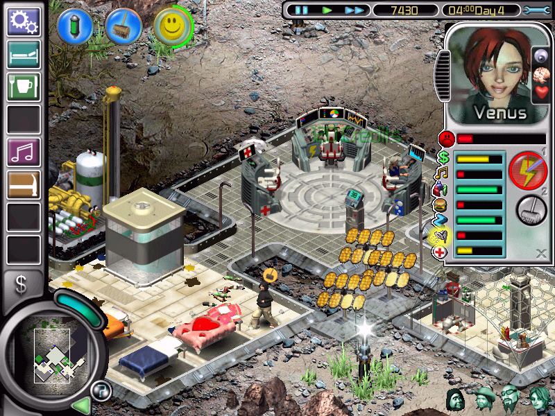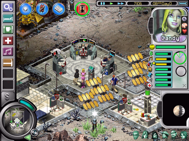 シムピープルが,画面外に無限に広がる社会を描いているのに対し,Space Colonyでは,それぞれ異なるパーソナリティを持った乗組員達の,"宇宙の果ての星にある基地"という閉塞的な空間での生活を描いている。もちろん,中には気の合わない人もいたりして,通常の経営シミュレーションのようにはコトが進んでいかないのが面白い。