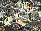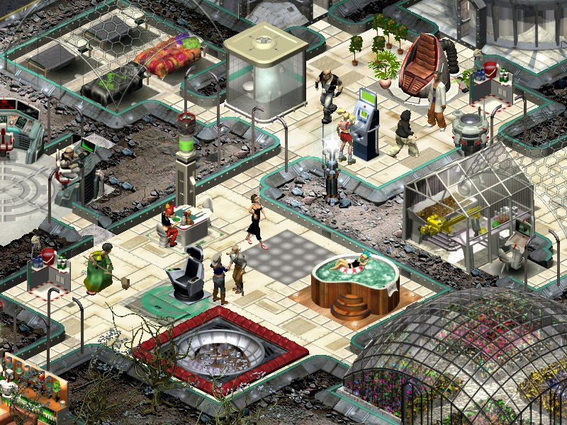 こうして入手した資金を使って,バイオドームにさまざまなオブジェクトを配置していくことで,キャラクター達の欲求を満たしていく。家具,食料設備,レクリエーションなどのカテゴリーに分かれていて,ディスコフロア(エンターテイメント),ソファー(社交),メスホール(食欲),ベッド(睡眠),シャワー(ハイジーン)などの施設を用意するわけだ。ゲームが進むにつれて,バーカウンターやジャグジーのような,豪華で巨大なオブジェクトも追加されていく。