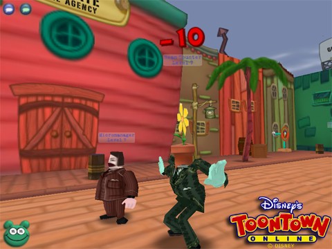 ToonTown Onlineのストーリーは,ミッキー達が平和に暮らすトゥーンタウンの街に,コッグ(Cog)というロボット集団が攻め込んできて,楽しく愉快な街の建物を一つずつ占拠しては味気のない工業ビルへと立て替えていくといった災難に遭っている……といった内容。新しいカートゥーンキャラクターとして街にやってきたプレイヤーは,そのコッグと立ち向かうことになるのだ。