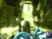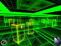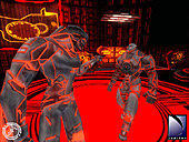 Tron 2.0でTritonシステムのグラフィック技術が生きているのが,このレベルやオブジェクトの配色である。DirectX 9.0のプログラマブル・シェイディング機能で可能になったグロー効果が,映画そのままの,もしくはそれ以上の世界を作り出しているのである。グロー効果を単純に言えば,あたかもオブジェクトが自ら光を発しているかのように見せるテクスチャー効果で,カラー蛍光灯のように周囲に淡いハローができるものだ。グロー効果は,元々はNVIDIA社のプログラマによって提供されたものといわれており,Tron 2.0ではそのデジタルな世界観から,キャラクターの輪郭やグリッドラインに至るまでの表現に使われている。また,敵プログラムが破壊される時のパーティクル効果も非常に派手で,四角や線状の破片が飛び散るなどの演出が目を引く。これらの効果のため,使用マシンに必要なスペックは高くなると見られ,最低でもPentiumV世代のCPUに32MB以上のグラフィックカードが必要になるということだ。