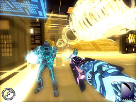 Tron 2.0で,プレイヤーの行く手を遮るのは,セキュリティ・プログラム,ウィルスに汚染したプログラム,さらにはデータレイスに操られたプログラムやコードたち。中には,画面中を覆うような巨大なプログラムも存在する。我々の知る各種プログラムは,システム内の世界ではすべて人間や動物風モンスターの形状で存在しているという世界観だ。よって,プレイヤーのクエストとは本質的に関係のないプログラムたちも,ゲーム内ではNPCとして登場し,ときには有益な情報源となる。プレイヤーをデジタルに変換したMa3aも,女性キャラクターとしてストーリーに大きく絡んでくるようだ。