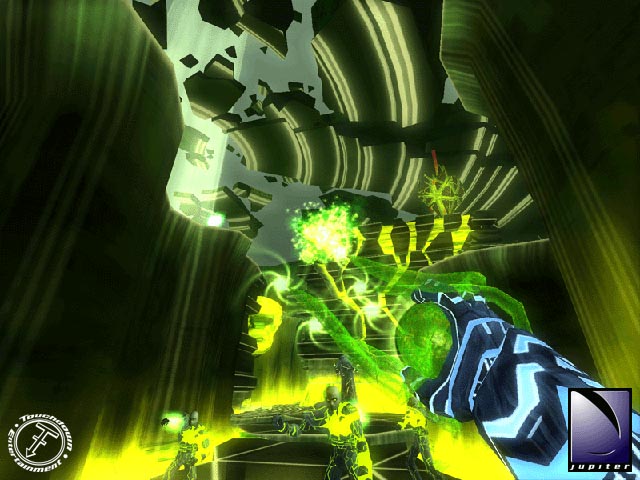 非常に強力な武器で,プレイヤーが飛んで行く方向をコントロールできるだけでなく,フリスビーのように手元に返ってくる。基本的なプログラムであれば1〜2回のヒットで倒すことができるという。さらに,敵の射撃をはね返すのにも使えるようだ。また,壁に当たると回転力が増加し,攻撃のパワーを増強できる。 |