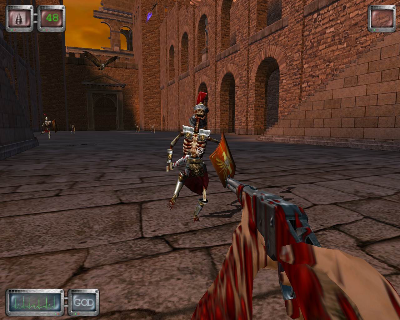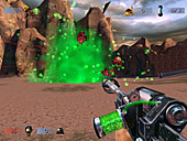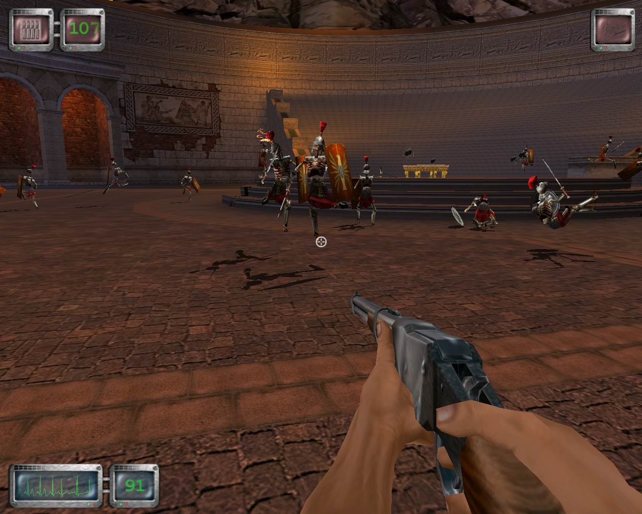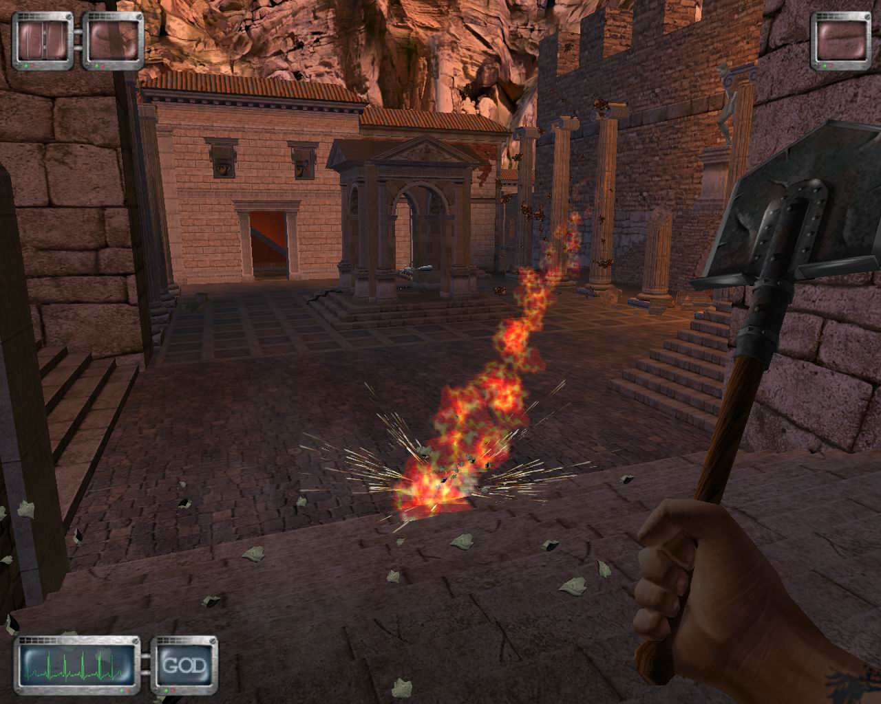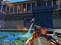 Will Rockのゲームスタート当初はいきなりミノタウルスが襲いかかってくるのだが,ウィルが初期装備で所持しているのは9mmのハンドガンとショベルのみ。これで何とかやりくりしながら,マップ上に散らばる他の武器を拾っていく。古代ギリシャになぜショットガンやマシンガンが落ちているのかは説明されていないが,クロスボウや手榴弾,地雷なども用意されている。ほかの兵器も興味深いものが多く,敵を石化して崩してしまうメデューサガン,敵が風船のように肥大して破裂するアシッドガン,小型の核爆弾を噴射して半径6mの周囲は丸ごと溶解するアトミックガンなどもある。これらの武器は,全部で11種類と最近のFPSにしては少なめだが,それぞれがまったく違った効果を持っている。アシッドガンのような,敵が死ぬ前に形状を変化させていくアニメーションは非常に面白い。