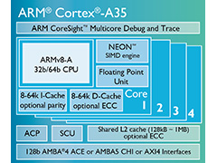 英国時間2015年11月10日,ARMは,モバイル機器向けの新型CPUコア「Cortex-A35」を発表した。64bit命令セットアーキテクチャ「ARMv8-A」を採用するエントリーモデルで,低価格スマートフォン向けのSoCにも,ARMv8-Aに対応するCPUコアを統合できるのが特徴だ。採用SoCは,2016年後半に登場する見込み。