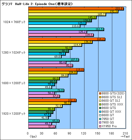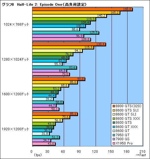 続いて「Half-Life 2: Episode One」(以下HL2EP1)の結果をグラフ7,8にまとめた。GeForce 8600 GTS SLIはGeForce 8800 GTS(320MB)に完敗。GeForce 8600 GT SLIは,GeForce 7950 GTと互角以上に渡り合っている。