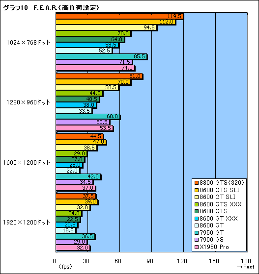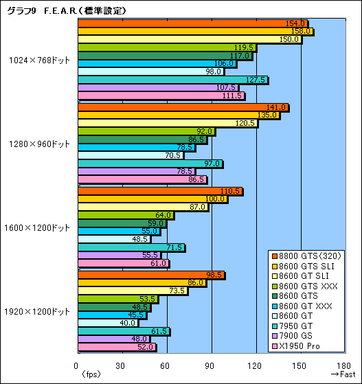 もう一つFPSから,今度は「F.E.A.R.」(Version 1.08)の結果である(グラフ9,10)。レギュレーション3.1で採用しているFPSのうち最も描画負荷の高いF.E.A.R.だけに,GeForce 8600 GTS SLIのスコアがGeForce 8800 GTS(320)を上回ったのは標準設定の1024×768ドットのみ。GeForce 8600 GT SLIも,標準設定ではGeForce 7950 GTを全解像度で上回るものの,高解像度では地力,もっといえばメモリ周りやROPユニットの違いが原因でスコアを落としていく。