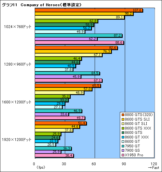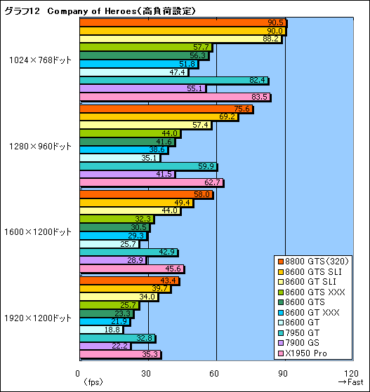 描画負荷の高いRTS「Company of Heroes」(Version 1.4)の結果は,F.E.A.R.と同じような傾向を見せる(グラフ11,12)。いずれにせよ,GeForce 8600シリーズを用いた場合における現実的なディスプレイ解像度はSLI構成で1280×1024ドット以下,シングルカードでは1024×768ドットということになるだろう。