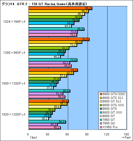 レースシム「GTR 2 - FIA GT Racing Game」(以下GTR2)の結果をグラフ13,14で見てみよう。GTR2は比較的描画負荷の低いタイトルであるため,標準設定の1024×768ドットだとCPUのボトルネックによりフレームレートの頭打ちが見られるのが,これまでのテスト結果と大きく異なる。
