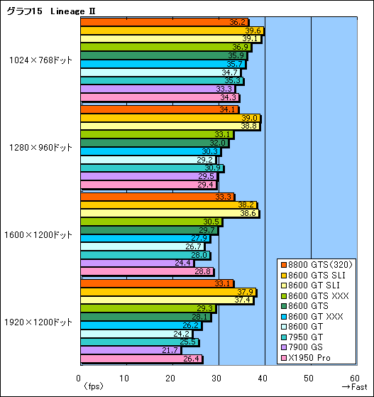 最後にMMORPG「Lineage II」のスコアをまとめたのがグラフ15だ。Lineage IIはSLIが“効く”タイトルなのだが,ここではGeForce 8600 GTS/GT SLIがGeForce 8800 GTS(320)に完勝。一方,クロックアップモデルの効果はわずかである。