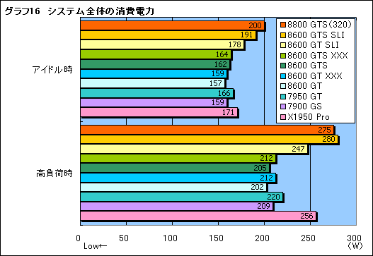 パフォーマンス検証に続いて,消費電力の測定に入ろう。ここでは,OSの起動後30分間放置した直後を「アイドル時」,3DMark06を30分間リピート実行し,その間で最も消費電力の高かった時点を「高負荷時」として,それぞれの時点におけるシステム全体の消費電力をワットチェッカーで計測した。その結果をスコアとしてまとめたのがグラフ16である。