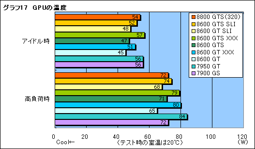 そんなグラフ16時点におけるGPUの温度を,GeForceファミリーのGPU温度も測定できるATI Radeon向け多機能ユーティリティ「ATITool 0.26」で測定。その結果をグラフ17にまとめた。