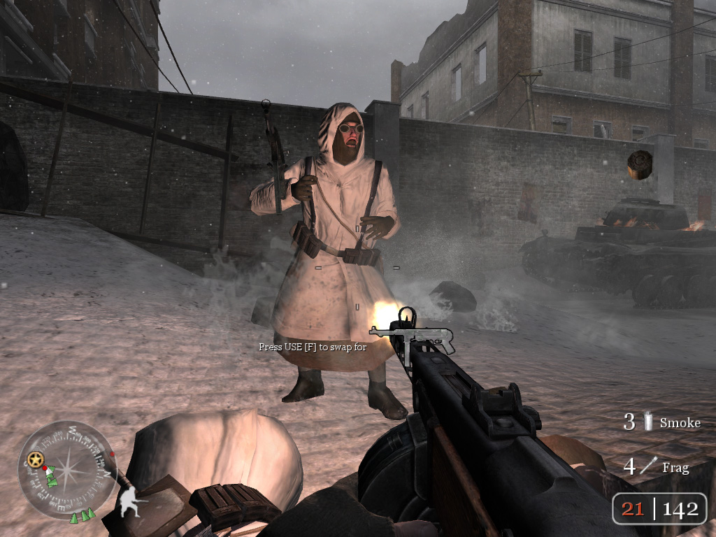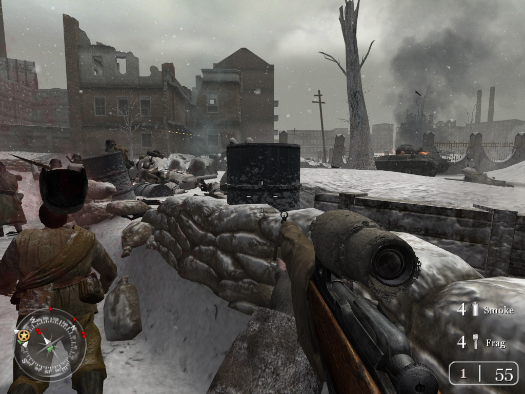 “絶対になりたくない職業ナンバーワン”として,よく挙げられるのが「第二次世界大戦中のソ連軍の新兵」だ。CoD2では,プレイヤーはまずソ連第13親衛ライフル師団の新兵ヴァシーリ・イヴァノビッチ・コスロフ二等兵として,モスクワ近郊の訓練施設で手榴弾の代わりにジャガイモを投げて練習したあと,スターリングラードに侵攻してきたドイツ軍を相手に戦うことになる。雪と氷と血と炎の戦場だ。女性兵士も出てくるので,とくに何かあるわけではないけど,いいですね。