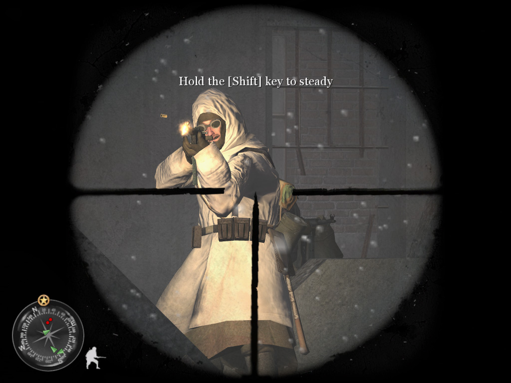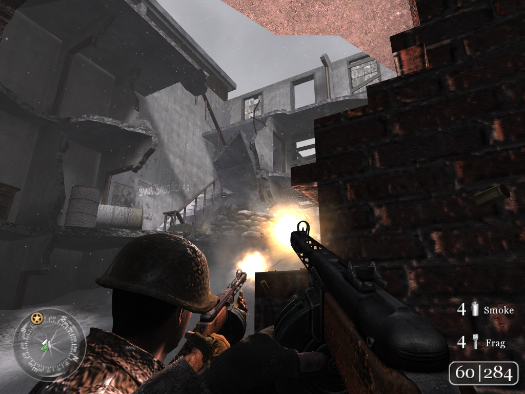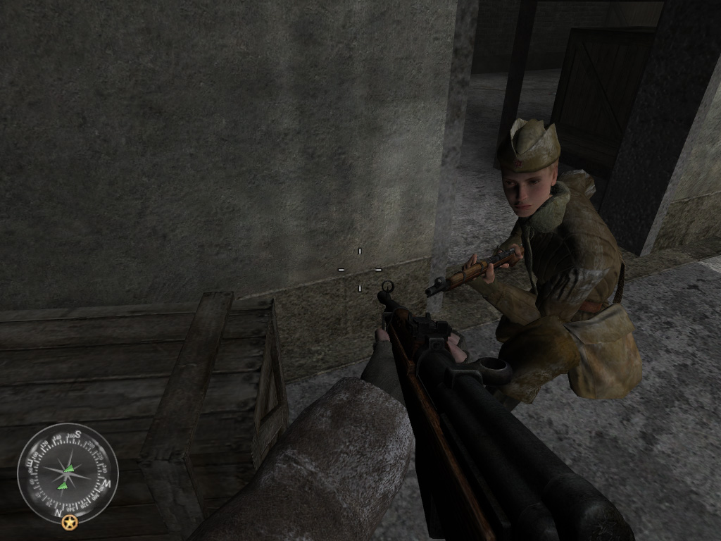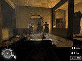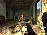 | ソ連編は市街戦。スターリングラードで,部屋を一つ一つ奪い合うような激戦に耐えていなければならない | ソ連編の主人公ヴァシーリは,映画「スターリングラード」の主人公と同じ名前ゆえか,狙撃任務が多い | ゲーム全編を通じて,一人で戦う局面はない。頼れる戦友が常にかたわらにいるのだ。ときどき頼りにならないが |