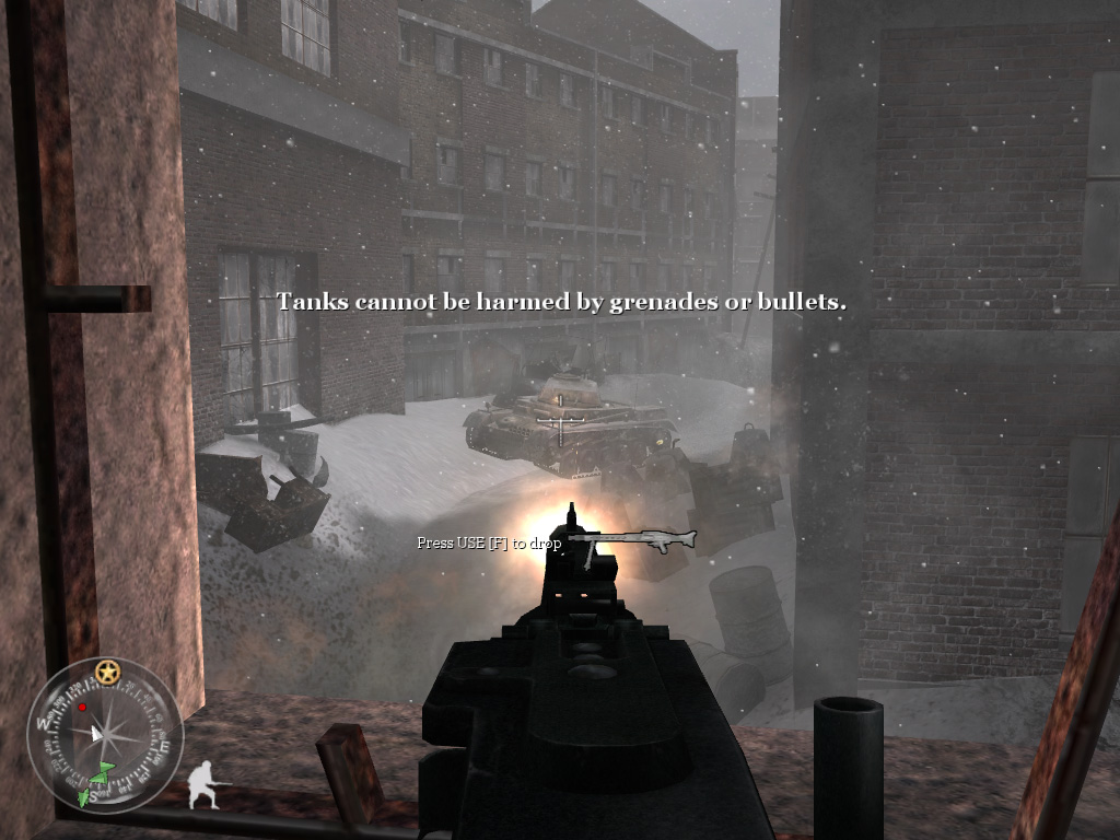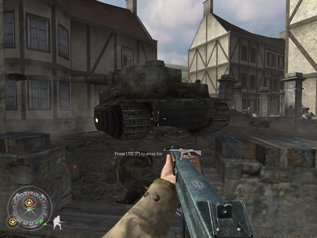 | ヒル400に突撃するアメリカ軍。銃を撃っていないときにはマップしか表示されず,画面は非常にすっきりしている | アメリカ軍パートの最後は,1945年5月のライン渡河だ。終戦までほんの数日だというのに,運がありませんね | 迫力満点のタイガーも出現。転輪とキューポラからして初期型だな,などと言ってはいけない。オタクだと思われるぞ |