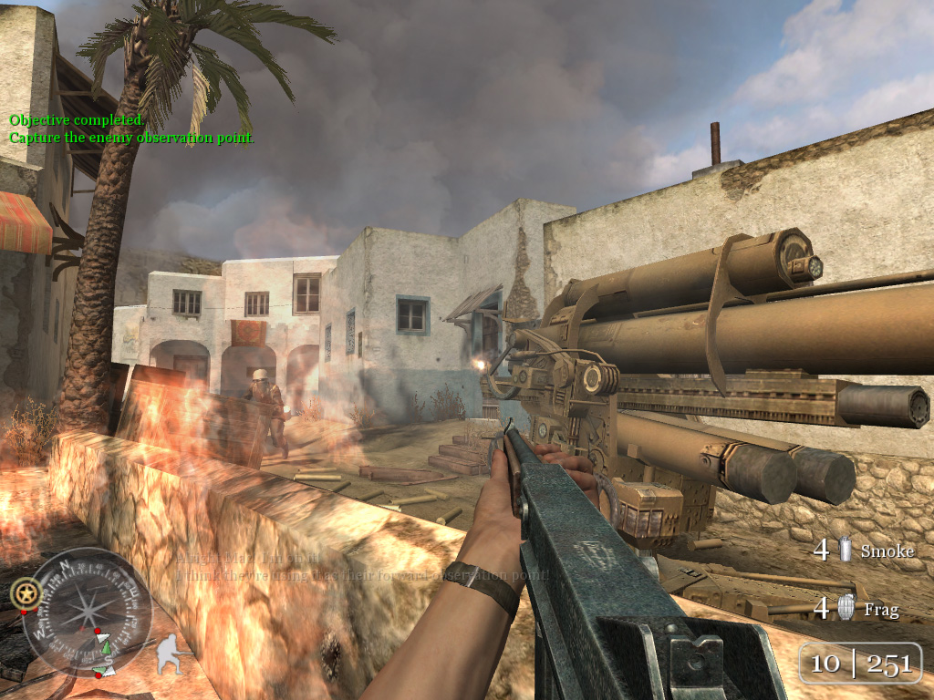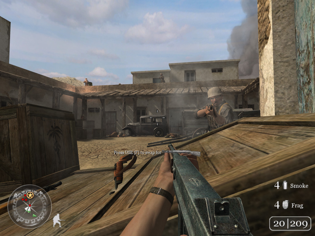 こういった場合,目標となるポイントに到達するか,あるいは与えられた命令(燃料をすべて破壊,とか無線機を破壊とか)を達成することでゲームを進行させられる。前作までのように,前進するにつれて登場する敵を倒し,周辺をクリアにしてから次へ進むのとは異なり,必ずしも敵兵をすべて排除する必要はないのだ。迂回し,弾雨をくぐり,駆け抜ける,といった戦略が取れるようになったわけで,慣れないうちはちょっと戸惑うかも知れないが,なんというか,まるでマルチプレイをしているような雰囲気もあり,戦場はさらに本物らしくなった(行ったことはないが)。