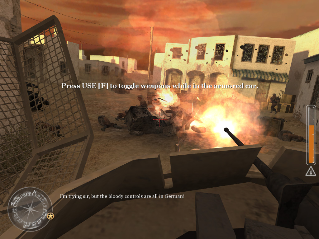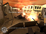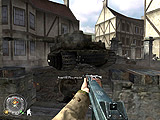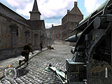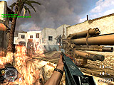 | ドイツ兵と切り結びながらエキゾチックな町並みを駆け抜ける。ディテール豊かな88ミリ砲にご注目いただきたい | 前作までのプレイヤーにはおなじみのプライス軍曹が,またまた登場。ドイツの装甲車を乗っ取って敵中突破を図る | 機関砲は撃ち続けていると過熱して使用不能になるので面倒だ。パンツァーファウストを食らわないよう気をつけろ |