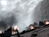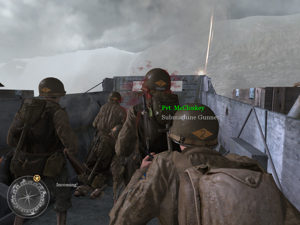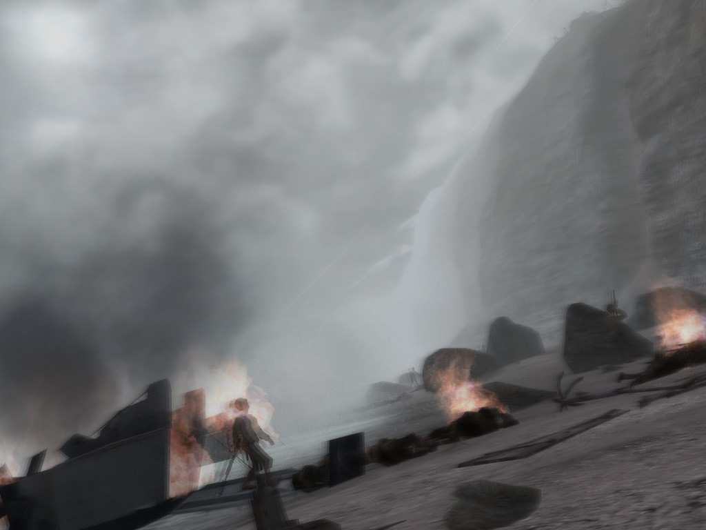 | もう,これなくしてはアメリカ軍とはいえないくらいおなじみの「オマハビーチ」。とはいえ,今回はわずかに離れたオック岬が舞台だ。上陸用舟艇から阿鼻叫喚の浜辺へ。必死に崖を登っても,待っているのは地獄の戦場 |