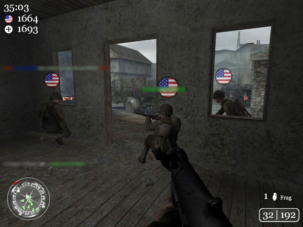 | マガジンを交換しているときに限って敵が出てくるような。瓦礫となった古い町並みと5月の空が美しい | 息つく暇もない戦闘が終わり,集合地点に戻ってみると,大佐が待っていた。狂乱の大戦ももうすぐ終わる | デスマッチモードでは30秒以上生き延びることが少ない私だが,チームデスマッチなら,まあ,なんとかなるかも |