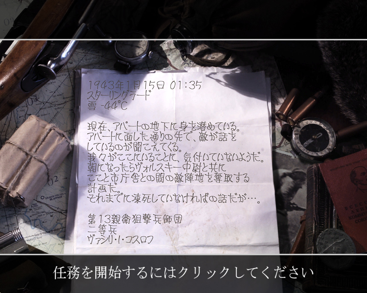 | 日本語ならミッション選択なども簡単に行えるし,ムービーの内容も分かりやすく,たいへん助かる。それにしても,コスロフ二等兵は字がへたくそである。……というか,ちょっとかわいらしい字だ。女子高生か何かだろうか | ||