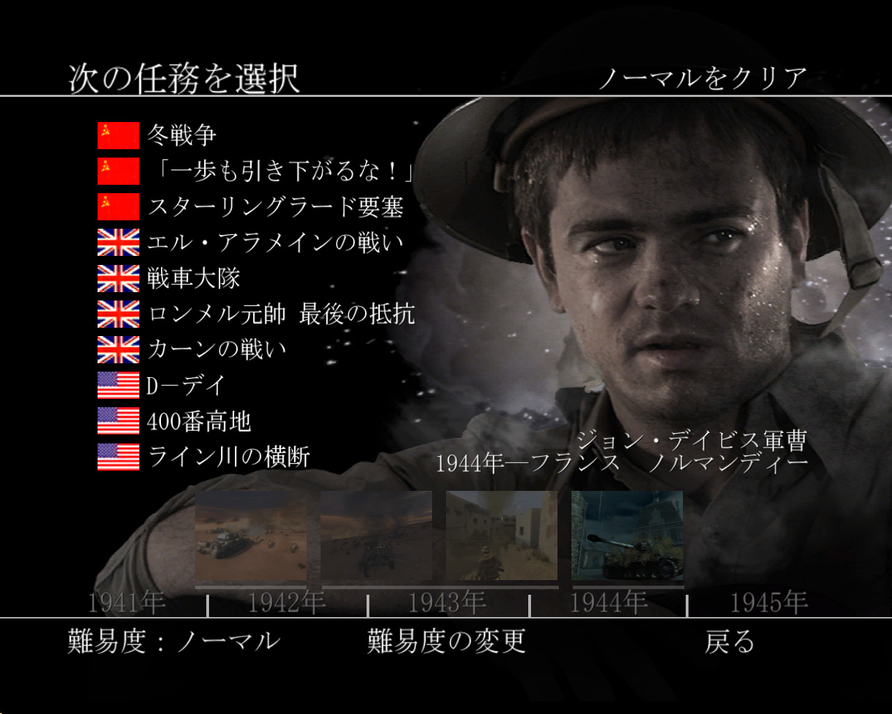 ヴァシーリのミッションを二つクリアして1942年になると,イギリス陸軍ジョン・ディビス軍曹のミッションがアンロックされる。こんなふうに,時系列に沿ってキャンペーンが進んでいき,この段階でイギリス軍のミッションに行ってもいいし,そのままスターリングラードでソ連の残りのミッションを戦ってもいいわけだ。
